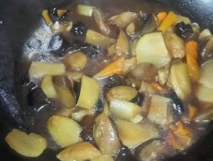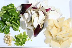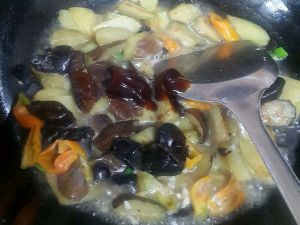 茄子,青椒,土豆洗净切滚刀块。香菇去蒂泡发;切好的土豆浸在冷水里以防变色