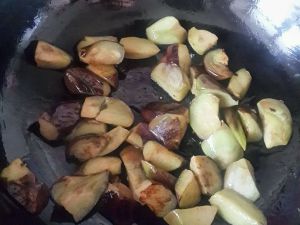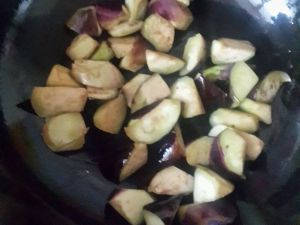 土豆煎好,盛出来,还是剩那些油,把茄子倒里煎,茄子会把油吸净,小火,煎软,