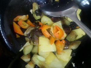 接着锅底留一点油,葱姜蒜炒香,放入土豆,茄子,青椒