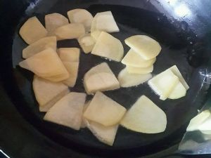 锅里放油,比平时炒菜多一点点,土豆切片下锅煎至边金黄,小火,不要把土豆弄碎