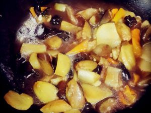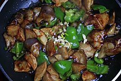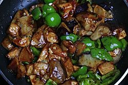 放入青椒香菇继续翻炒后加盐,适量老抽,糖加水焖烧10分钟