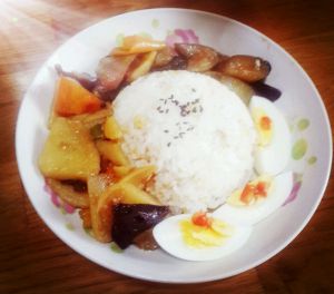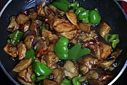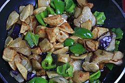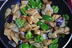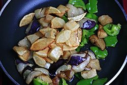 锅中留少许油,放点糖在加入葱蒜,倒入土豆,茄子翻炒在加入尖椒,在倒入少许水淀粉