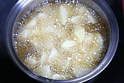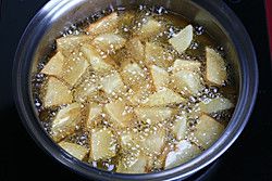 热锅冷油,油烧至六分热,土豆下锅油炸至熟,颜色金黄。