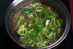 待油温变热,放入柿子椒块,炸好捞出待用。