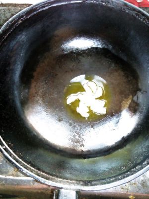 刷锅倒入菜籽油烧热,放入蒜粒,略炒一会儿。