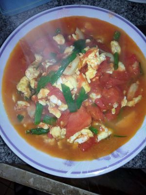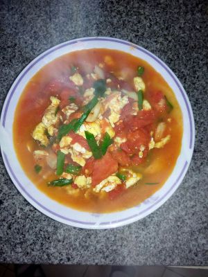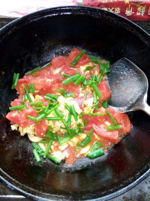 放西红柿,米醋翻炒片刻,加入鸡蛋和葱花 盐,就可以出锅了。
