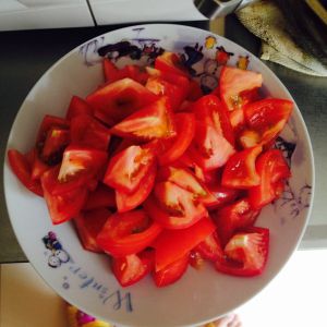 趁着刚才炒蛋剩下的油锅,炒西红柿,加入蒜末,我家喜欢西红柿稀烂一点,可以加点开水,煮一下。