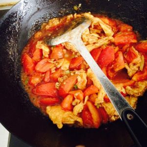 在放一点油,放入西红柿翻炒,放少许盐,西红柿炒软炒出汁,放入煎好的鸡蛋,放入少许鸡精出锅。