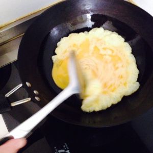 起油锅,炒蛋多一点油,蛋更松更香,翻炒几下,基本成型就可以盛出备用,注意:不要炒得太老。