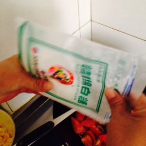 炒炒后放白糖,放鸡蛋,放老抽,放盐,鸡精。炒炒炒~