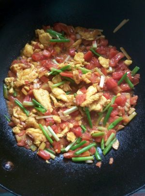 鸡蛋先放油锅里炒熟起锅,在把葱花跟西红柿在锅里炒,在把鸡蛋放里一起炒一下就OK啦。