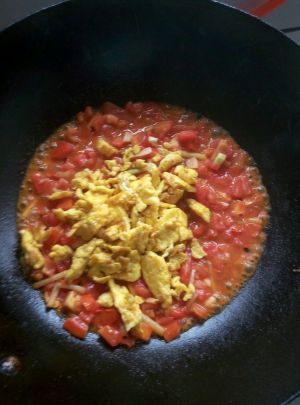 到入西红柿,多翻炒一下,把汁炒出来,再放入白糖,把鸡蛋到进去继续翻炒,