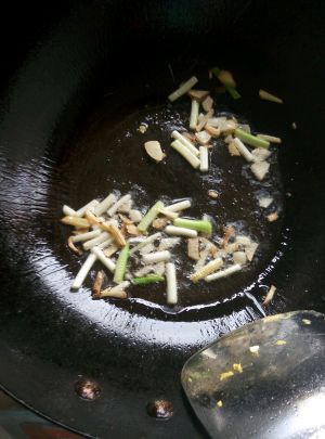 翻炒之后再倒入葱段,继续翻炒至熟,放入盐,关火,放入鸡精