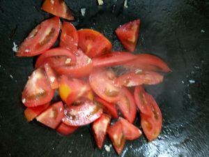锅里留些许油,加入西红柿翻炒至汤汁变红。