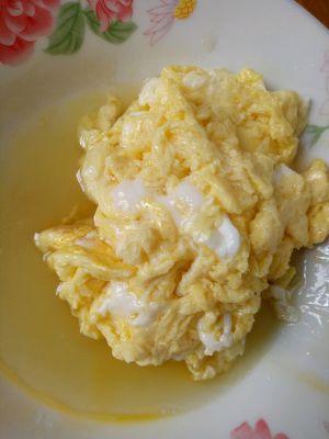 锅里加油烧到8分热,加入打散的鸡蛋,快速翻炒。成型后关火,倒入盘子。