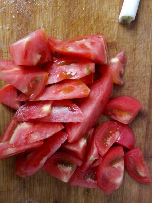 西红柿切块,鸡蛋打散。切葱备用