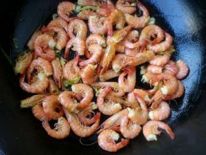 虾油出后依次放入,糖,盐料酒和姜丝, 翻炒出锅
