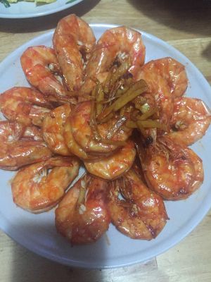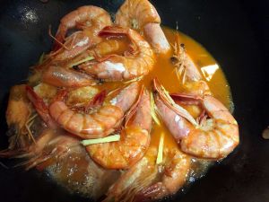 大虾炒变色,烹入料酒,放葱、姜、酱油、糖煸炒。