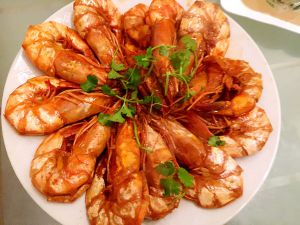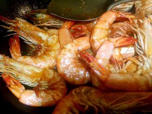 糖色炒好后,放入虾。用油煎虾,用铲子多按按虾头。待到虾皮焦焦的就可以了