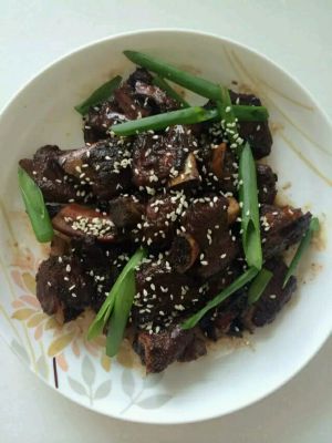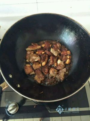加料酒1酱油2糖3醋4,单位都是汤匙,炒匀后加开水,没过排骨,炖40分钟,出锅前加少许盐,收汁出锅