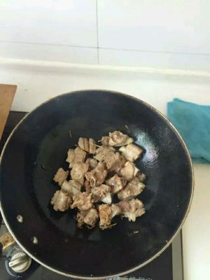 锅内倒入油,将姜切丝爆炒,倒入压力锅内空掉水分的排骨,翻炒即可