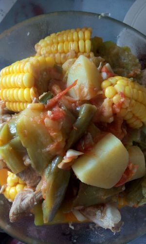 倒入之前处理好的豆角,窝瓜,玉米,倒入三大杯水,大火烧开后转中火炖制30分钟,出锅前用大火收干汤汁,加盐调味即可,
