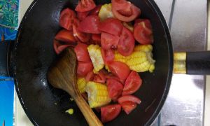 把苞米,西红柿,土豆,辣椒切块儿,茄子用手掰,比较容易入味。然后锅热后放油,放入苞米翻炒一会儿后放西红柿。