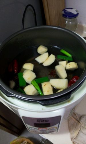 先把排骨用水焯一下,去血水,然后在阿迪锅中放入适量葱段,蒜,两片姜,大料瓣,干辣椒和苹果。ps:苹果可吸收一部分的油。