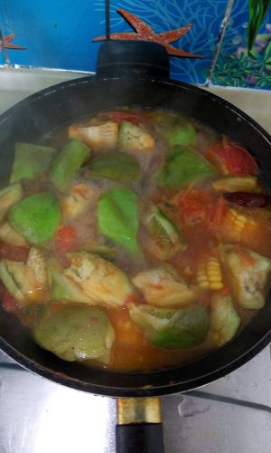 待快熟时放入切好的西红柿和辣椒。小炖一会就可以起锅了。