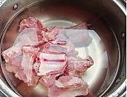 将腌制过的大骨头和碗中的料酒等一同倒入锅中,加入适量的水,少许白糖,煮沸