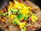 待肉汤开锅了等十分钟放入土豆,待土豆开锅后五分钟放入辣椒和压熟的排骨。