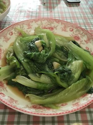 生菜煮熟摆盘,锅里热油,下蒜末炒香,加调好的料汁,料汁浓稠浇在生菜上。