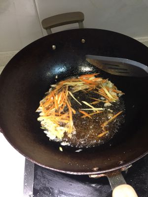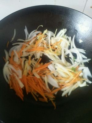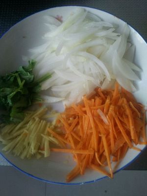圆葱,香菜,胡萝卜,姜分别切成条,留着备用