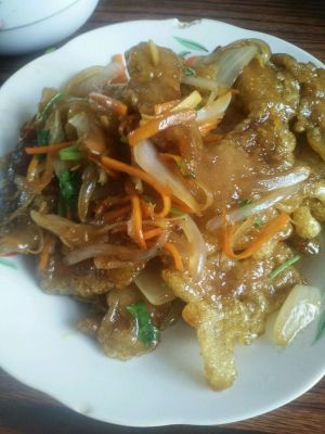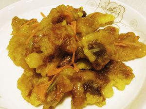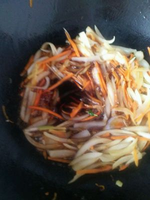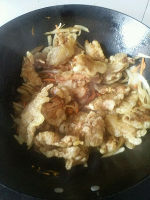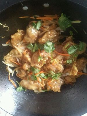 把料酒,白糖,柠檬汁,淀粉水,酱油,胡萝卜丝,葱丝倒入容器中,拌匀。锅内留少许油,倒入调汁和炸好的肉,大火翻炒几下(如果会掂勺,就更好了,掂几下让炸肉上挂满调汁即可)。 PS:事实上,应该再加点儿香菜调色和味的,但我做的时候,家里刚好没有了!大家做的时候,可以放点儿哦!^_^