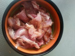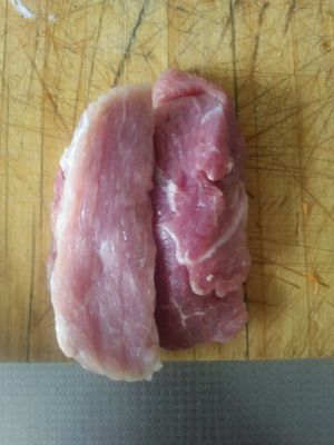 选择猪外脊,理由不知道。但据说比里脊好吃(图片的什么都不是就是瘦肉,家里没有里脊也没有外脊)切成片(大概2-3张银行卡厚度)