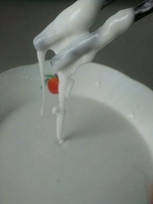 淀粉用水泡一个小时,看淀粉完全沉淀,把水倒出。倒入一个蛋清。用手使劲抓搓,让蛋清和淀粉完美融合(如果干就放点淀粉)