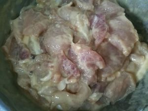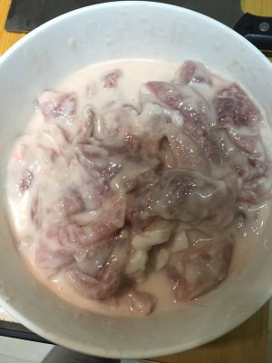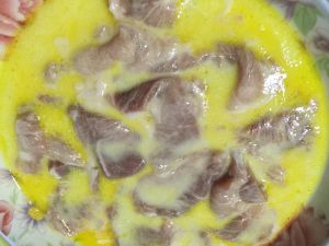 把肉片放着搅拌好的淀粉糊里,使劲使劲揉搓,让每一片肉都粘上淀粉糊