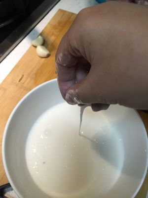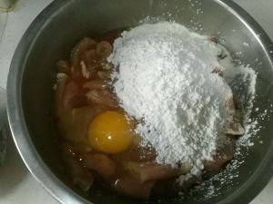 腌好后再加四勺淀粉,两勺面一个鸡蛋抓匀