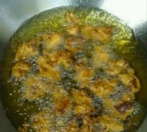 将煮熟的排骨放适量面粉淀粉少许盐搅拌均匀,在这说下,面粉放的量只是看干湿度放的,不宜太干哦!将锅倒入油烧滚冒烟就可以炸排骨了,炸时要翻动,炸至金黄