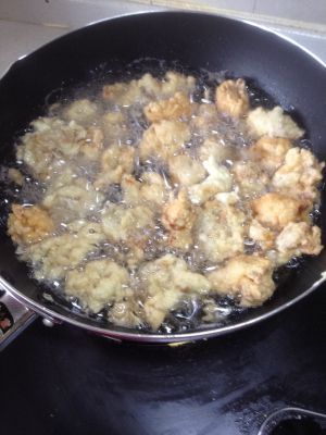 把面粉裹着的排骨放入油中煎至金黄色(火力不能太大)