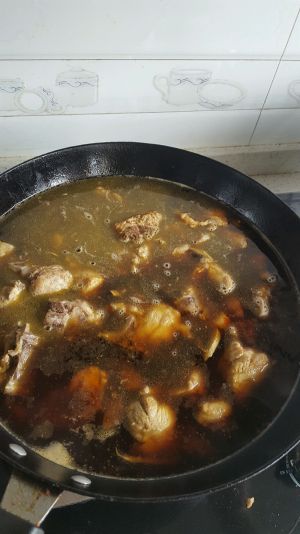 加酱油,一点点辣酱,冰糖大块,水,盖上锅盖中火煮入味