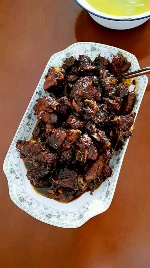 待颜色上去,排骨酥烂,加入水淀粉收汁(无需盐和味精)盛盘