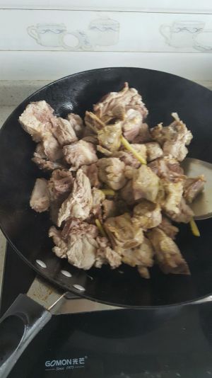 炒锅放适量油,烧至7成热放入排骨中火翻炒,力度别太大,当心溅油烫伤,炒至略黄即可,用盘子捞出备用
