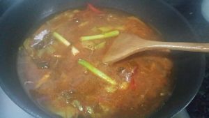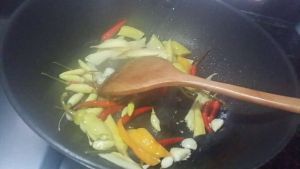 锅放油,先下蒜头爆香,再放酸姜辣椒炒