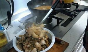 开小火,一定要小火,把腌制好的鱼片,一片一片放入锅中。