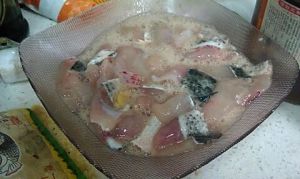鱼在菜市已让摊主杀好片好,所以只用洗一下,放料酒,姜,白糖腌制一下!芹菜,蒜,切好!