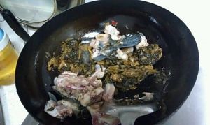 热锅润油,将酸菜下锅炒香,再下黑鱼的首尾骨头煸炒,待骨头变色加入适量的水