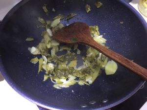 热锅冷油,放姜葱蒜辣椒爆炒酸菜。