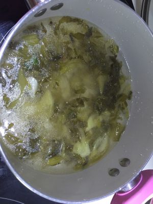 配菜水倒掉,加入清水,再煮沸清水,把酸菜放进去,焯水捞出,沥干水。