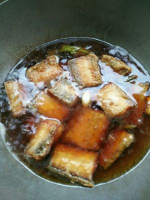 炒锅内放少许油,将煎好的鱼块放入,加入醋、生抽、姜和水,盖锅煮一会儿;